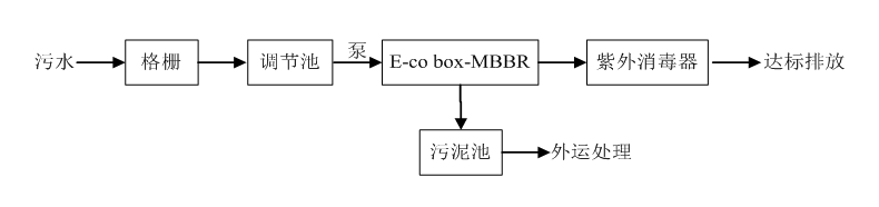 本項目污水來源主要為生活污水和收集的初期雨水。污水中污染物主要以有機物、氨氮、磷和懸浮物為主。結(jié)合相關(guān)工程實踐經(jīng)驗和國內(nèi)同類工程的比較,針對該污水水質(zhì)、水量特點,從工程的可靠性和設(shè)計的合理性出發(fā),本方案擬采用鵬凱箱“E-co box-MBR”一體化污水處理設(shè)備對該污水進行處理。工藝流程如下所示: