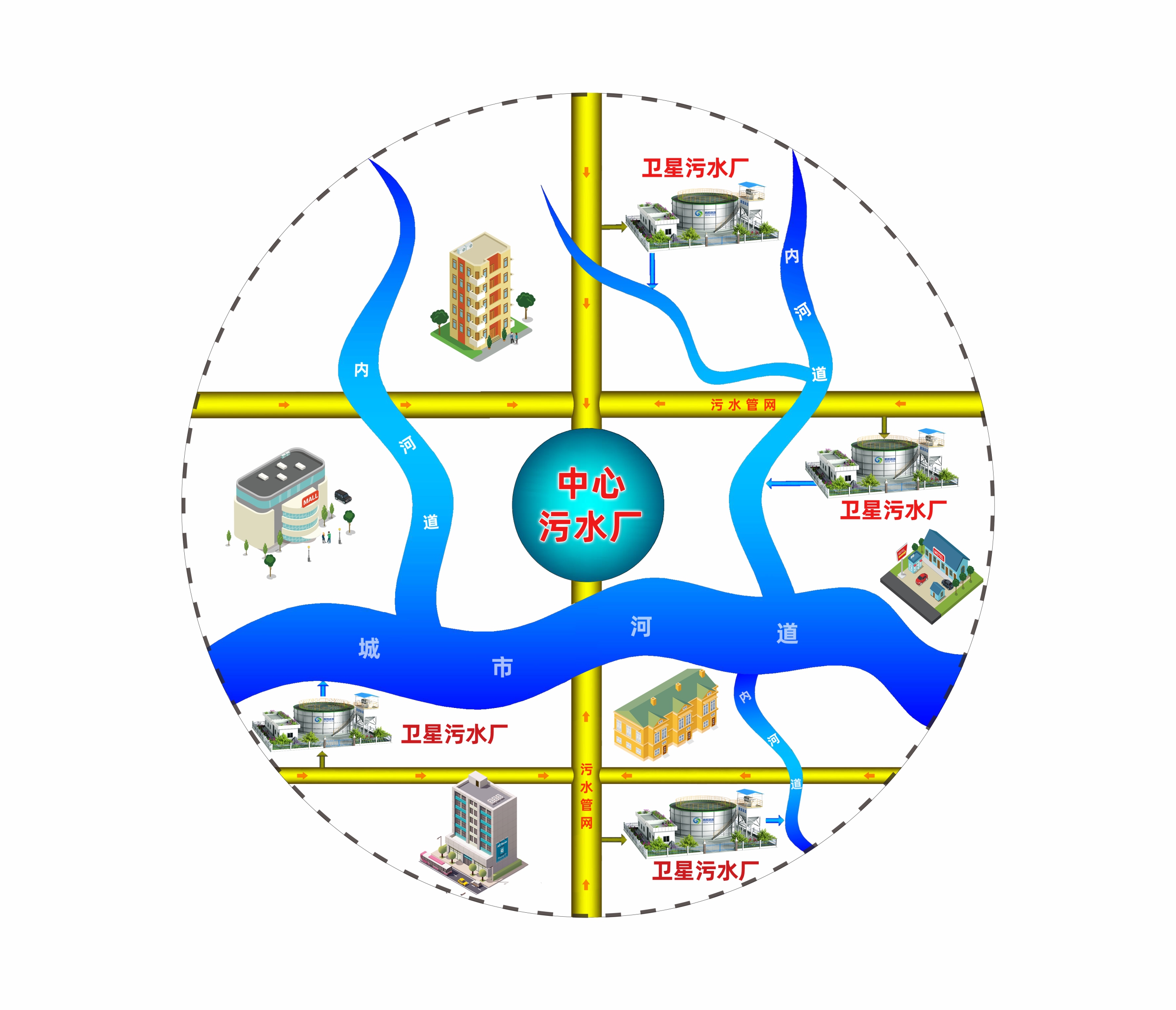 衛(wèi)星式污水處理系統(tǒng)示意圖