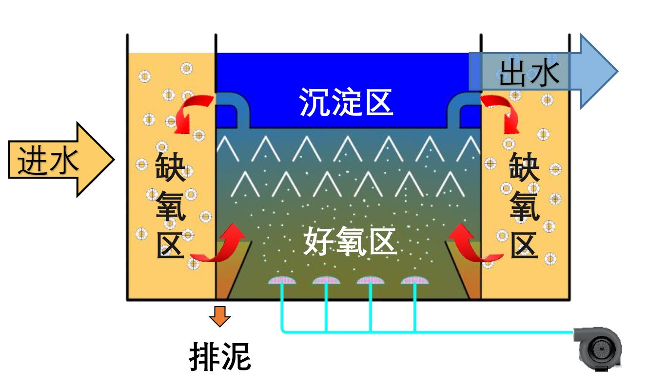 外圈添加MBBR填料,采用生物膜工藝,可實現(xiàn)同步硝化反硝化過程;內圈是鵬凱圓的核心,將好氧區(qū)和沉淀區(qū)進行疊加,中間通過三相分離器實現(xiàn)氣、水、泥的分離,可以使占地面積大幅減少;這樣做的好處在于沉淀區(qū)的沉淀污泥直接通過重力回流至好氧區(qū),不存在反硝化的環(huán)境,也沒有厭氧的環(huán)境,防止傳統(tǒng)沉淀池池底污泥反硝化造成的翻泥現(xiàn)象。