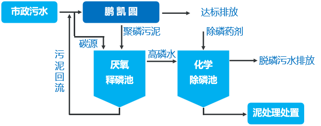 鵬凱圓污泥處理部分,為解決常規(guī)工藝里對于主工藝加磷的影響,鵬凱環(huán)境采用側流除磷工藝進行處理,將脫氮除磷的工藝進行分開,使脫氮除磷的效率更高。還有一點是延長污泥齡,使活性污泥發(fā)生內源呼吸,增加內源消耗,減少污泥產率。