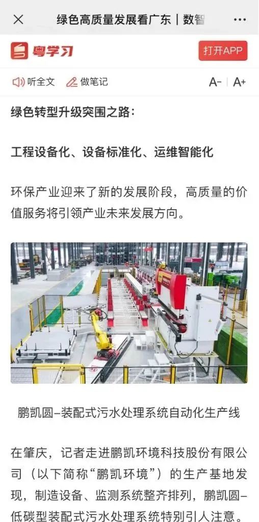 近年來,鵬凱環(huán)境作為裝配式污水廠開創(chuàng)者及水環(huán)境治理綜合服務商,始終以習近平新時代中國特色社會主義思想為指引,堅持走生態(tài)優(yōu)先、綠色發(fā)展之路,把全面深化改革、綠色轉(zhuǎn)型升級工作不斷向縱深推進,以“工程設備化、設備標準化、運維智能化”三化模式驅(qū)動技術(shù)產(chǎn)品化、產(chǎn)品工業(yè)化、數(shù)智化轉(zhuǎn)型升級,以科技創(chuàng)新撬動生產(chǎn)方式變革、企業(yè)綠色高質(zhì)量發(fā)展,激發(fā)了發(fā)展新動能,走出了一條具有鵬凱特色的綠色高質(zhì)量發(fā)展之路。